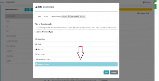 Login>Asset & PPM>Checklist and add the checklist. In the type option, you can check the option to add a document-related instruction named “File Attachment”(refer to screenshot)-