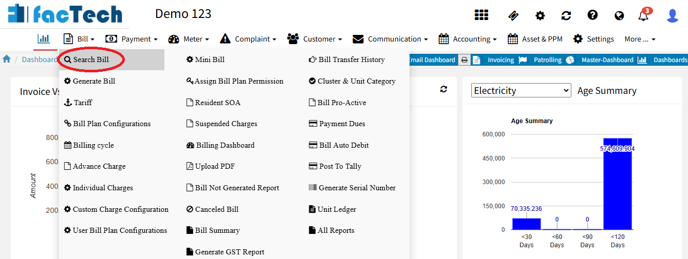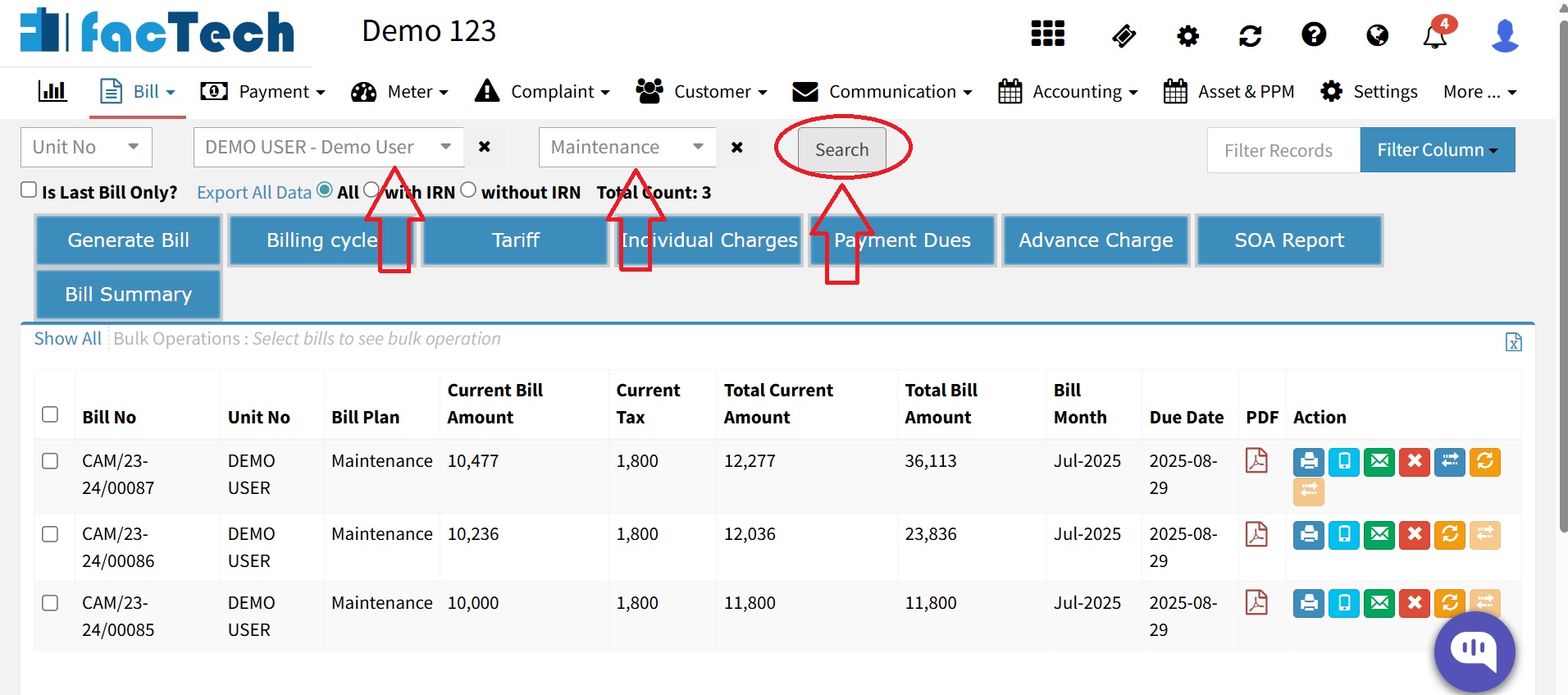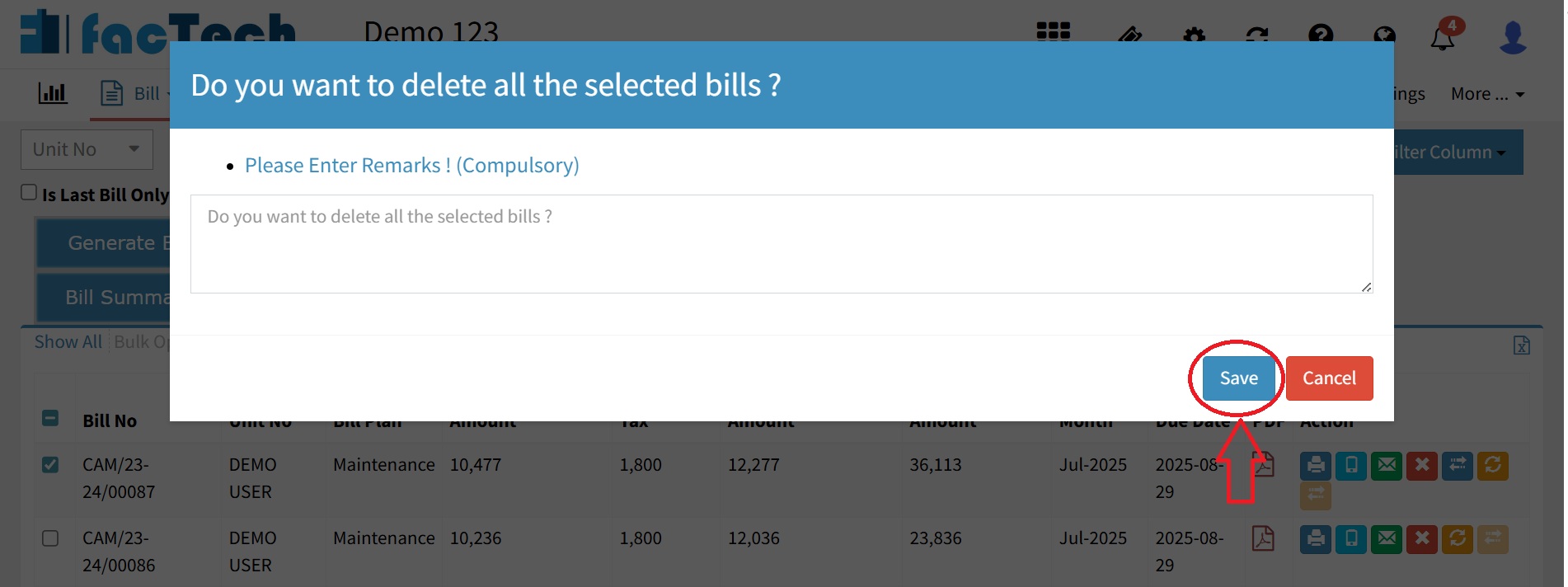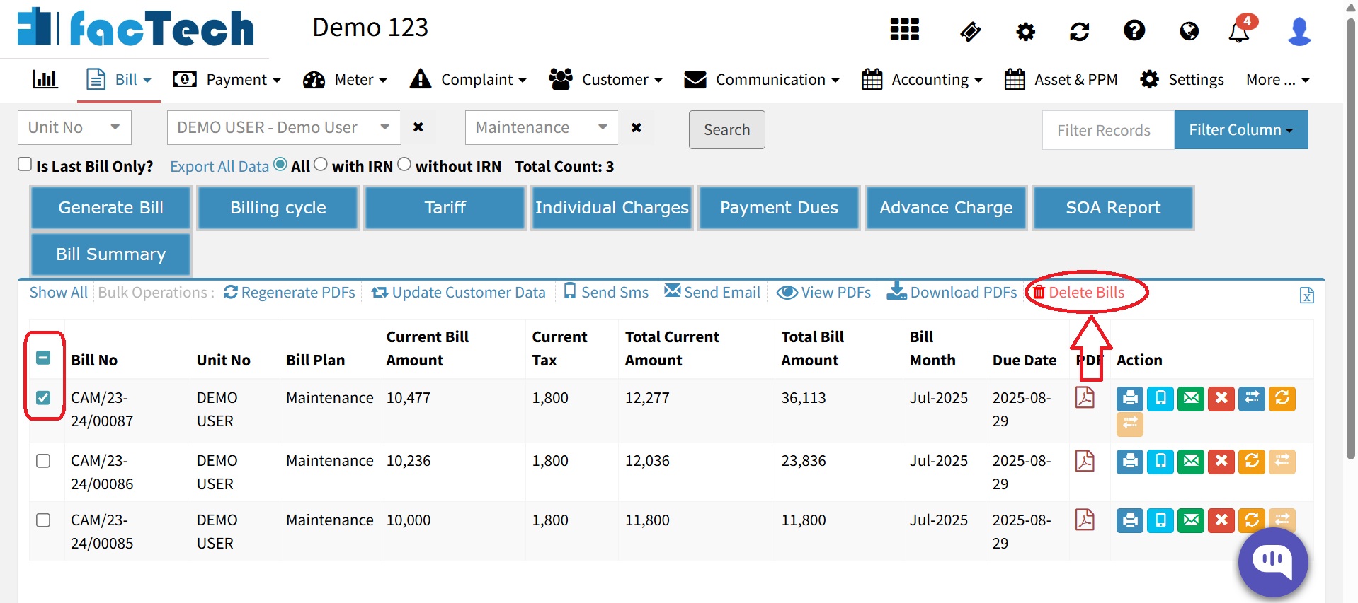Factech Automation allows users to cancel invoices based on Billing Cycle, Date Range, or Unit Number. Only users with bill cancel rights (Admin/Accountant role) can perform this action.