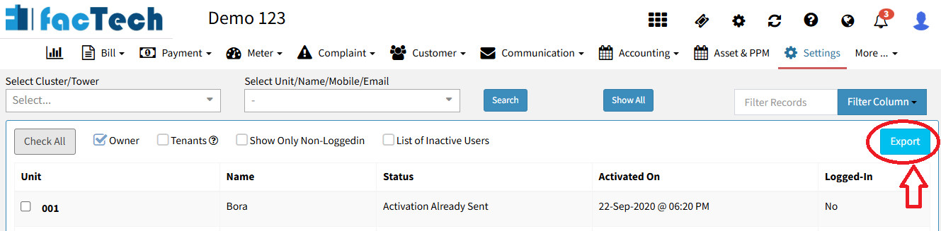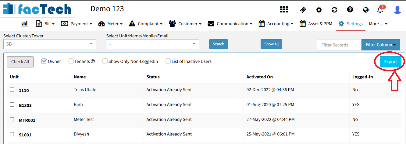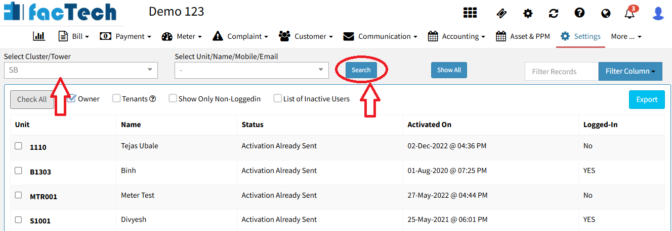 Admins have the flexibility to filter data using various criteria, including Tower, Cluster, Unit, Name, Mobile, or Email.
