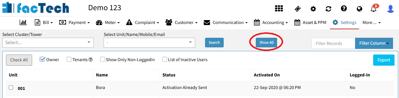 Click on Show All to view all unit/owner records.