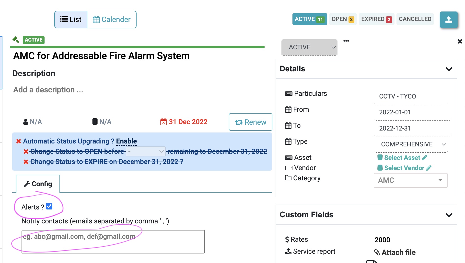 How to add alerts for AMC & Contracts? December 21, 2023 / Manvik A How to add alerts for AMC & Contracts? As admin, you can add email id of your team or vendor so that reminder is sent before the AMC is expired.1. Go to AMC and open that.2. Add Alert / Notification for AMC. Click on Config then select Alert Permalink Back to Top Manvik Interested in technology which touch lives and changes how we interact and work