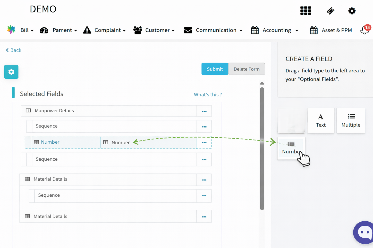 From the right panel, drag and drop the required field type to the left panel.
