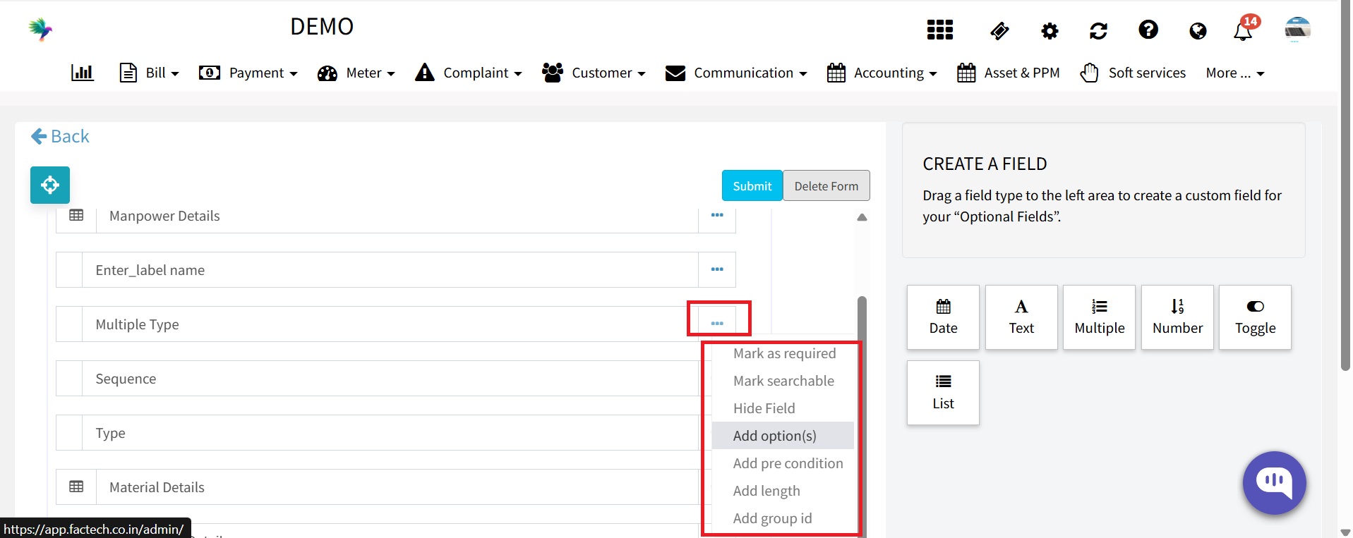 Add multiple choice options (Add Options), Mark the field as Mandatory, Hide the field if required