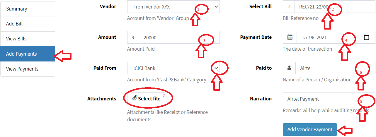 Step 2: click on “Add Payment” option from left drop down menu, enter details and click on “Add Vendor Payment”