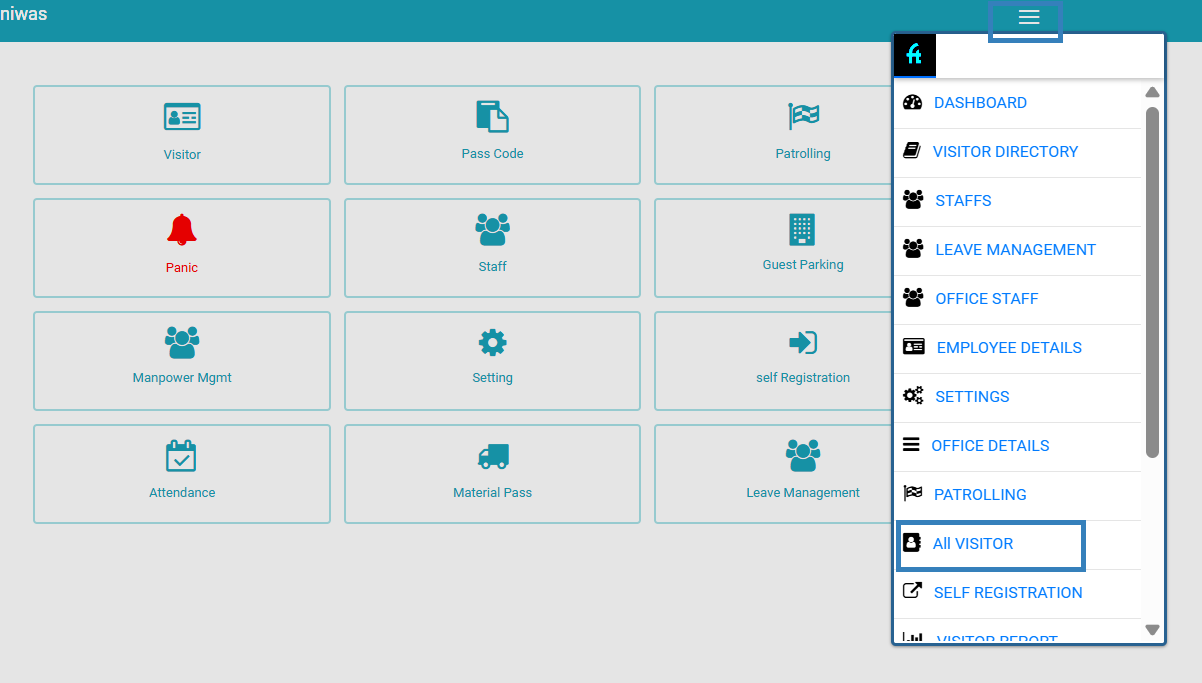 Step 1: Login to the FacTech>> Visitor >> Click on the ‘Menu’ & choose ‘All Visitors’