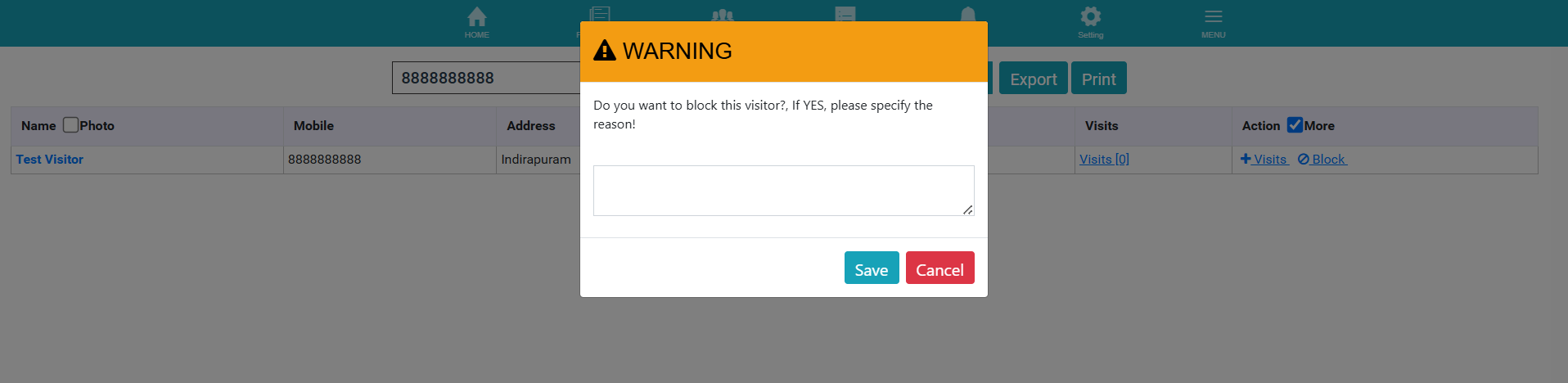 Step 4: Clicking the ‘Block’ button will bring up a ‘Warning’ window, where we need to confirm and provide a reason for blocking that visitor.