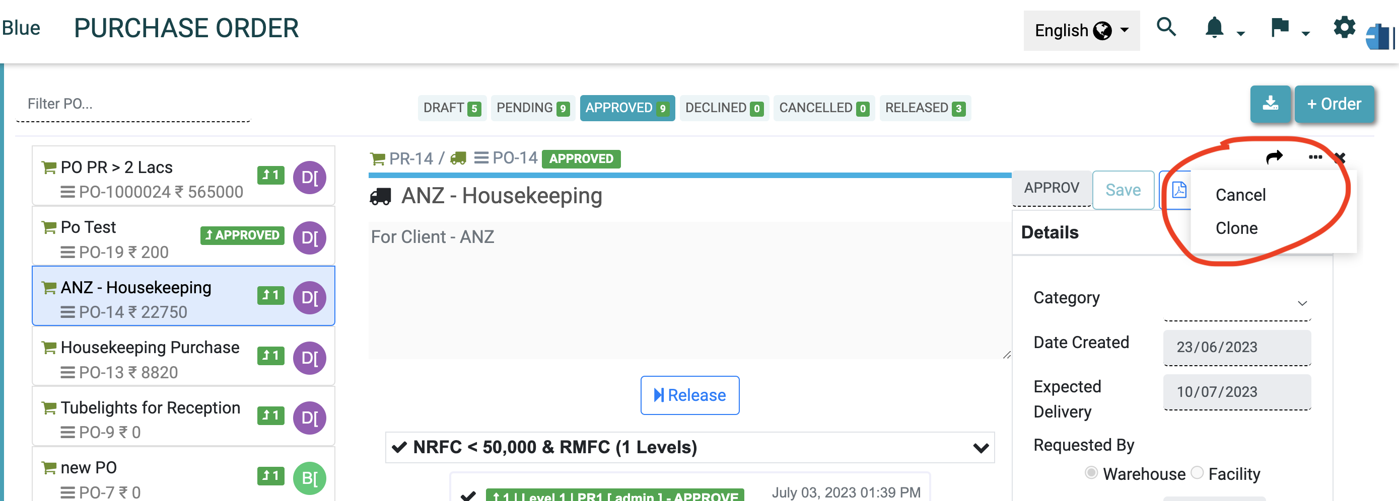 A Purchase / Service Order in PENDING or APPROVED stage can be cancelled at any point. To cancel a PO