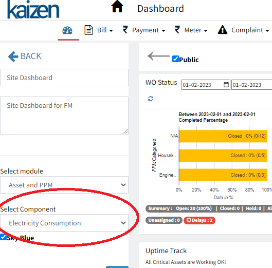 The electricity Usage dashboard component can be added by Admin in her dashboard (Dashboard -> Edit ) by selecting Electricity Consumption as shown below