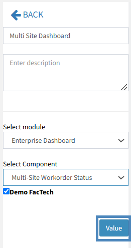 After entering the dashboard name and selecting the “Module” and “Component,” click on “Value” to view the dashboard components.