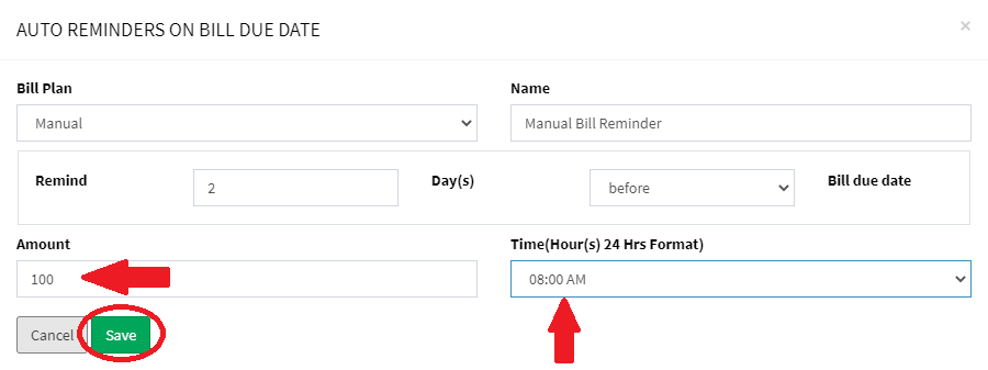 - In Amount you can enter the Amount of filter the records that reminder should be sent. e.g. if 100 then system will send reminder whose due is more than 100. Then Select the Time from the drop down menu at which the system will send reminder to that time. Once done Click on Save.