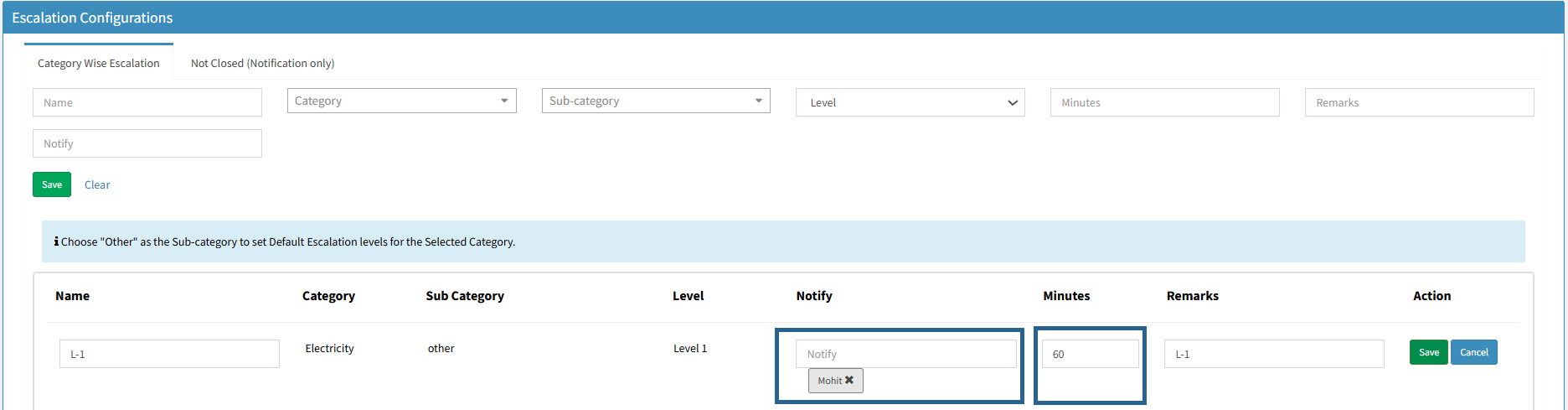 To edit the ‘Notify Person’ or ‘Time’, click the edit button. Then, select the ‘Notify Person’ or ‘Time’ (Time should be specified in minutes) and click the save button.