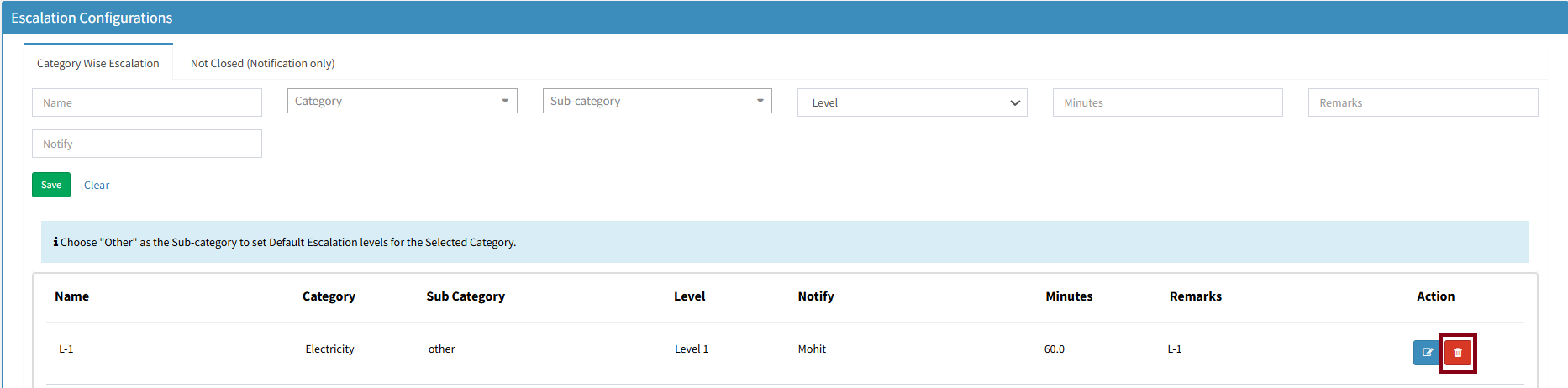 On the Complaint Escalation page, we can view the existing escalation matrix. Here, we need to select the escalation matrix we want to delete or edit.