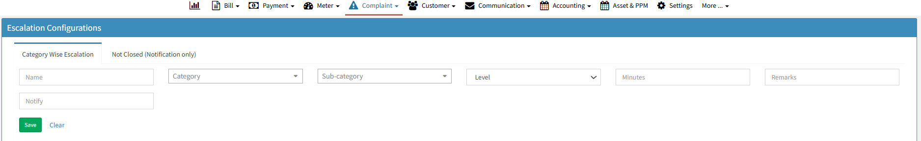 To add a complaint escalation, we have to add shown information on the complaint Escalation page(Time should be in minutes and the notify person will be in the admin list)