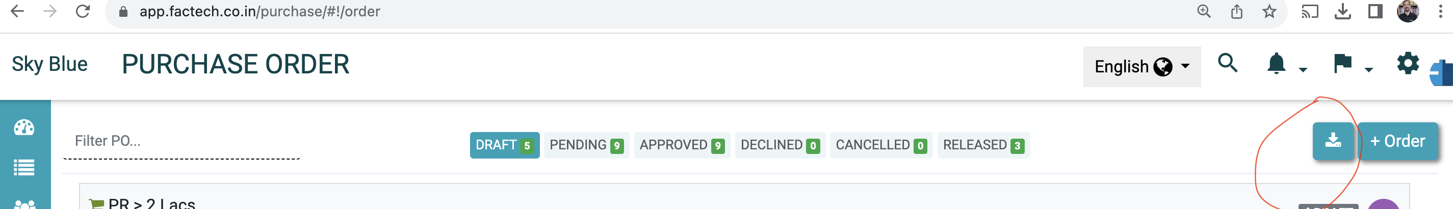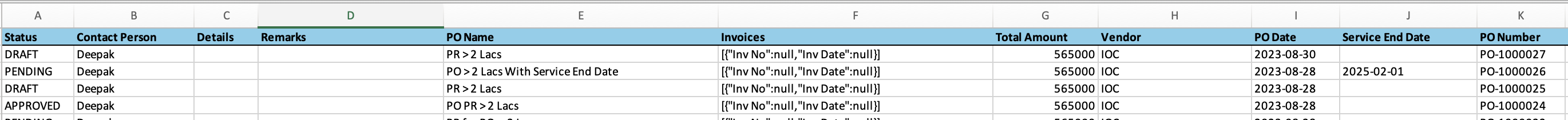 5. Click on Download Report and you will get excel sheet with fields including Status, Title, Amount, PO Number.