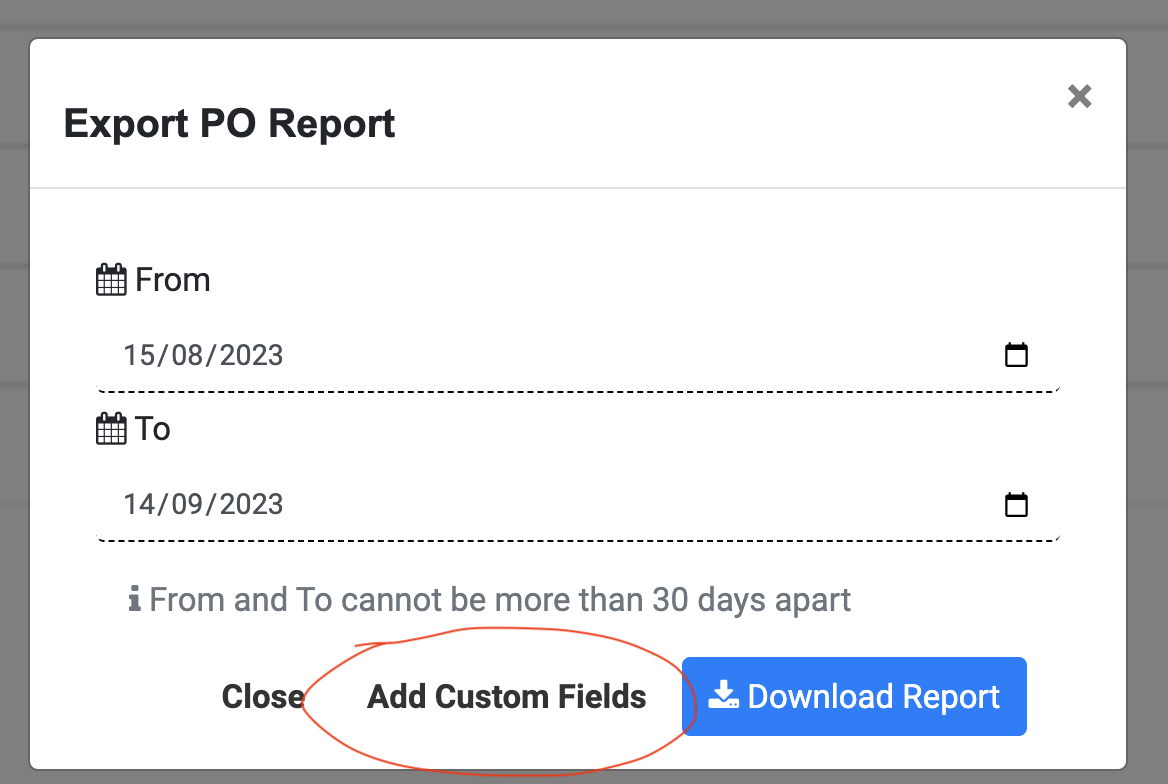 3. Choose date & Select Custom fields if you want those in PO exported list