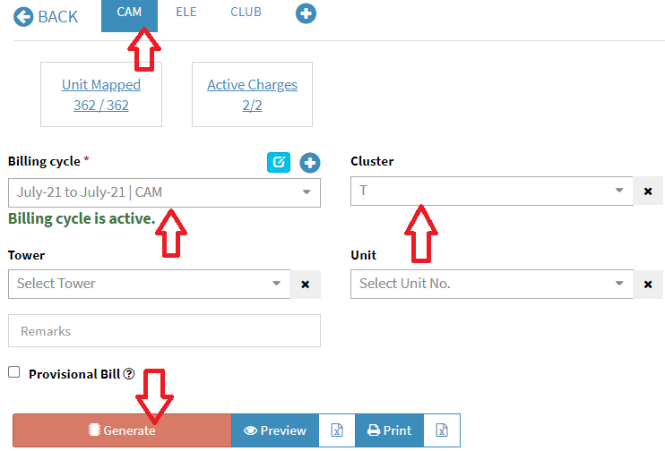 Step 2: Select bill Plan, bill Cycle, cluster and click on “Generate Bill”