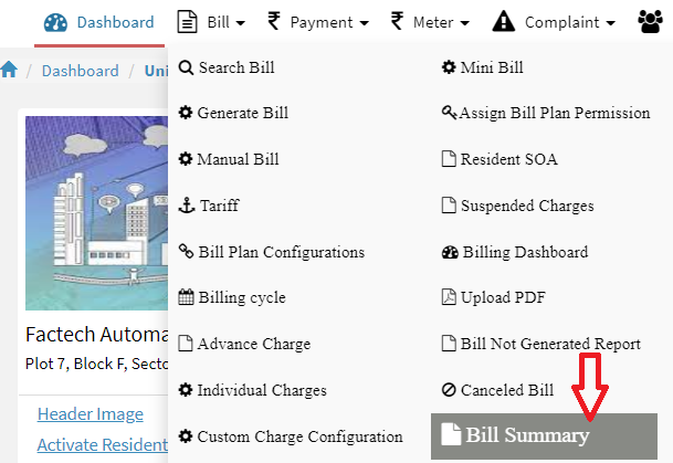 Step 1: Go to  Main Menu (Bill), Select “Bill Summary” option from drop down menu