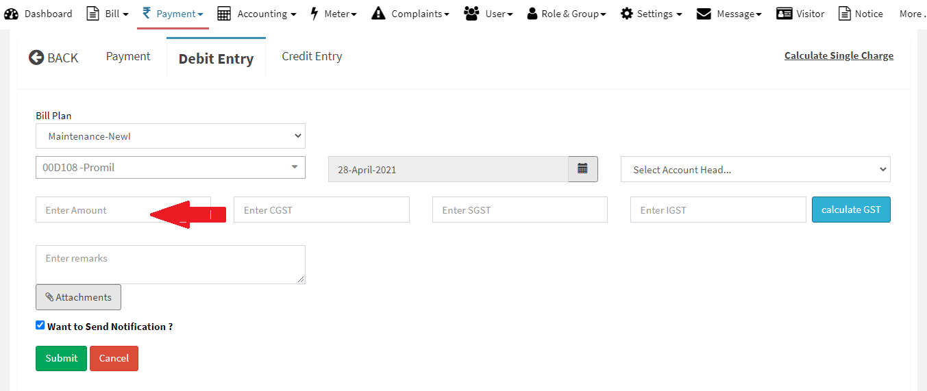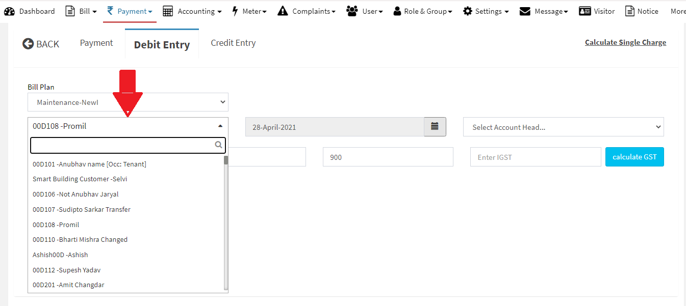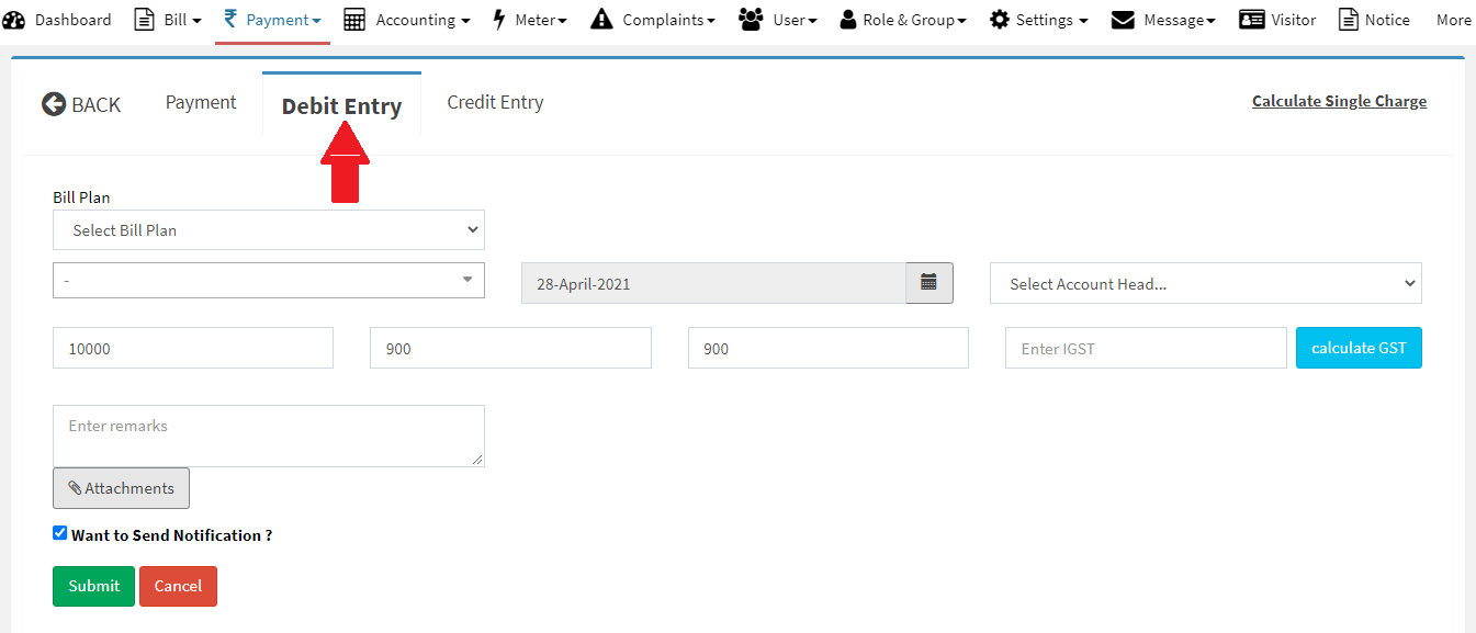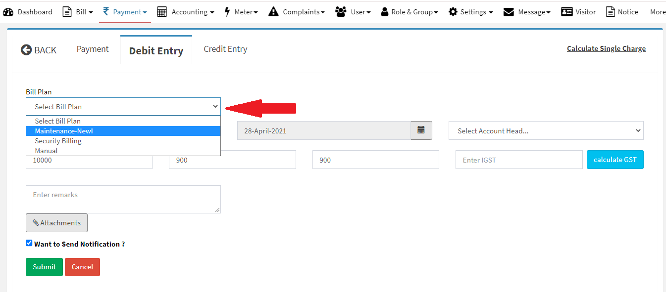 - Now Select the Bill Plan for which you want to make Debit entry.