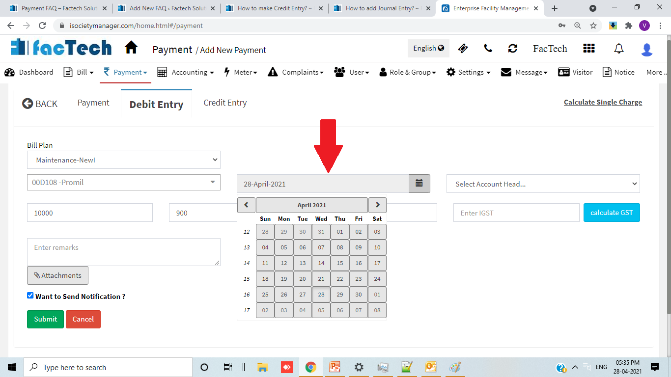 - Now Select the Date for the Debit entry. Note* Present Date is selected as system default.