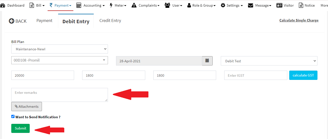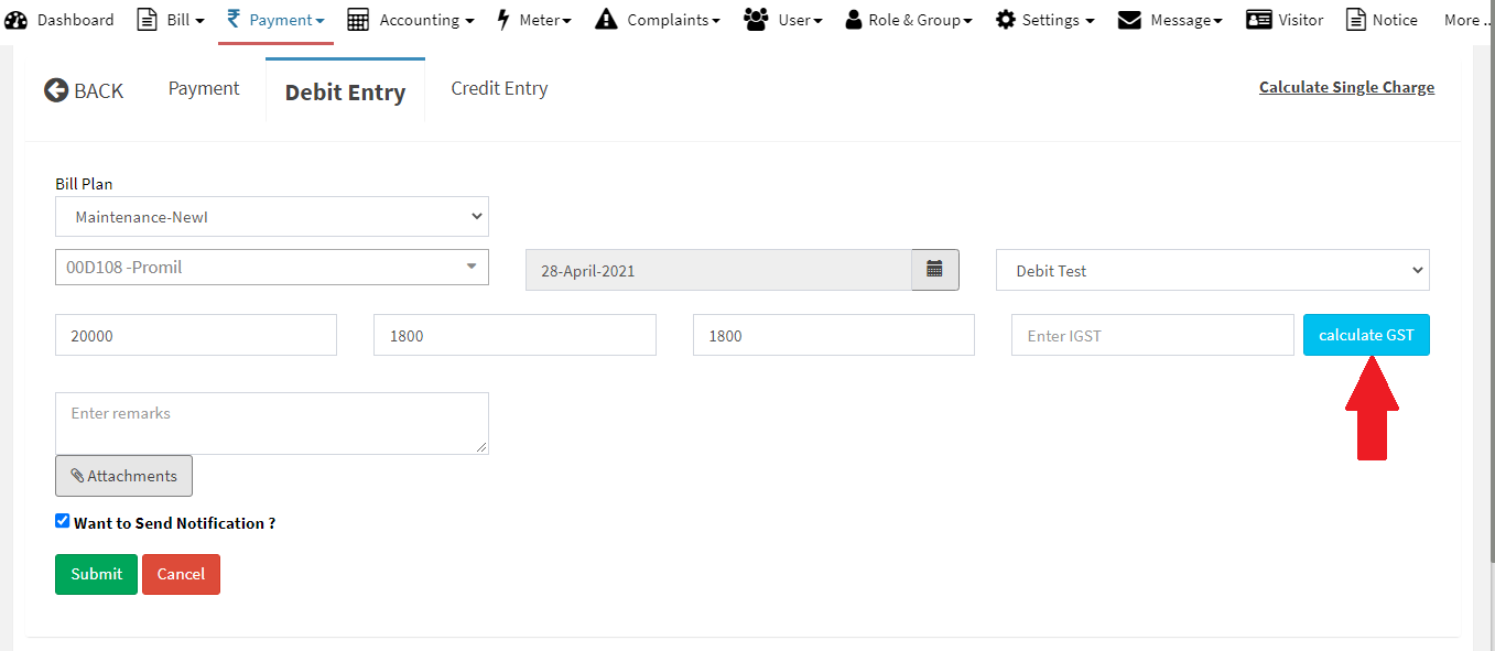 - You can also calculate the GST applicable on the Debit Amount by clicking on Calculate GST button.
