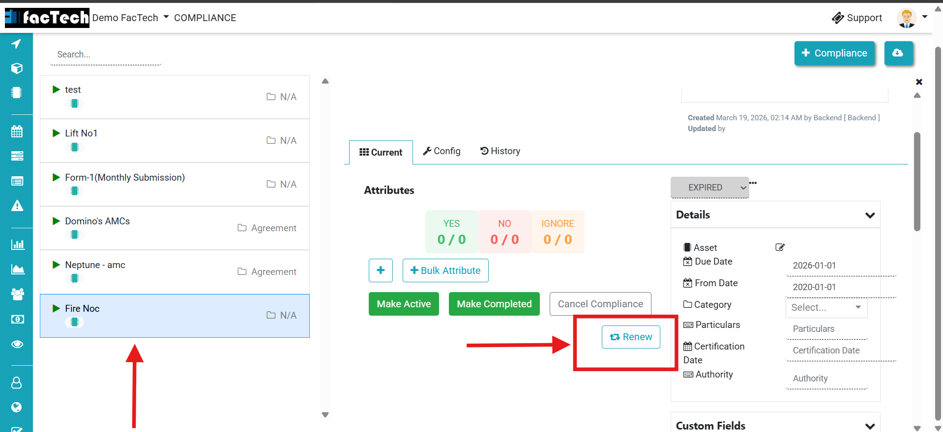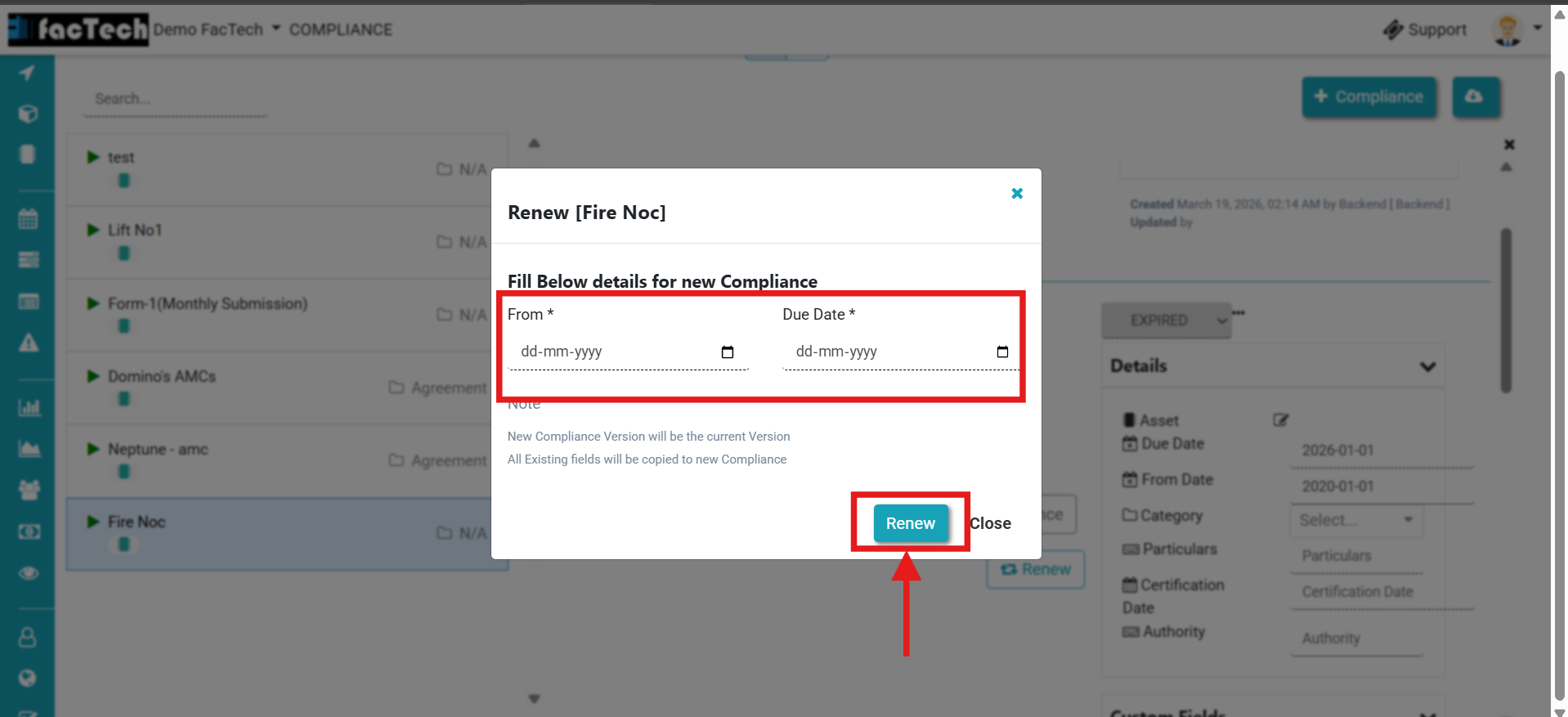 5. Enter the updated From Date and Due Date and Click on the Renew button to save changes.