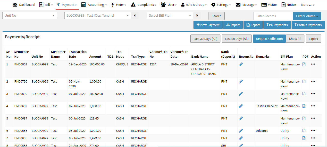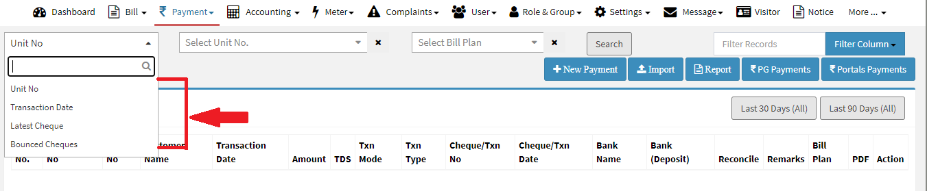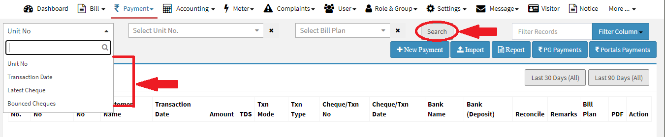 - Now select the modes you want to search the payment. e.g. unit, transaction date etc.