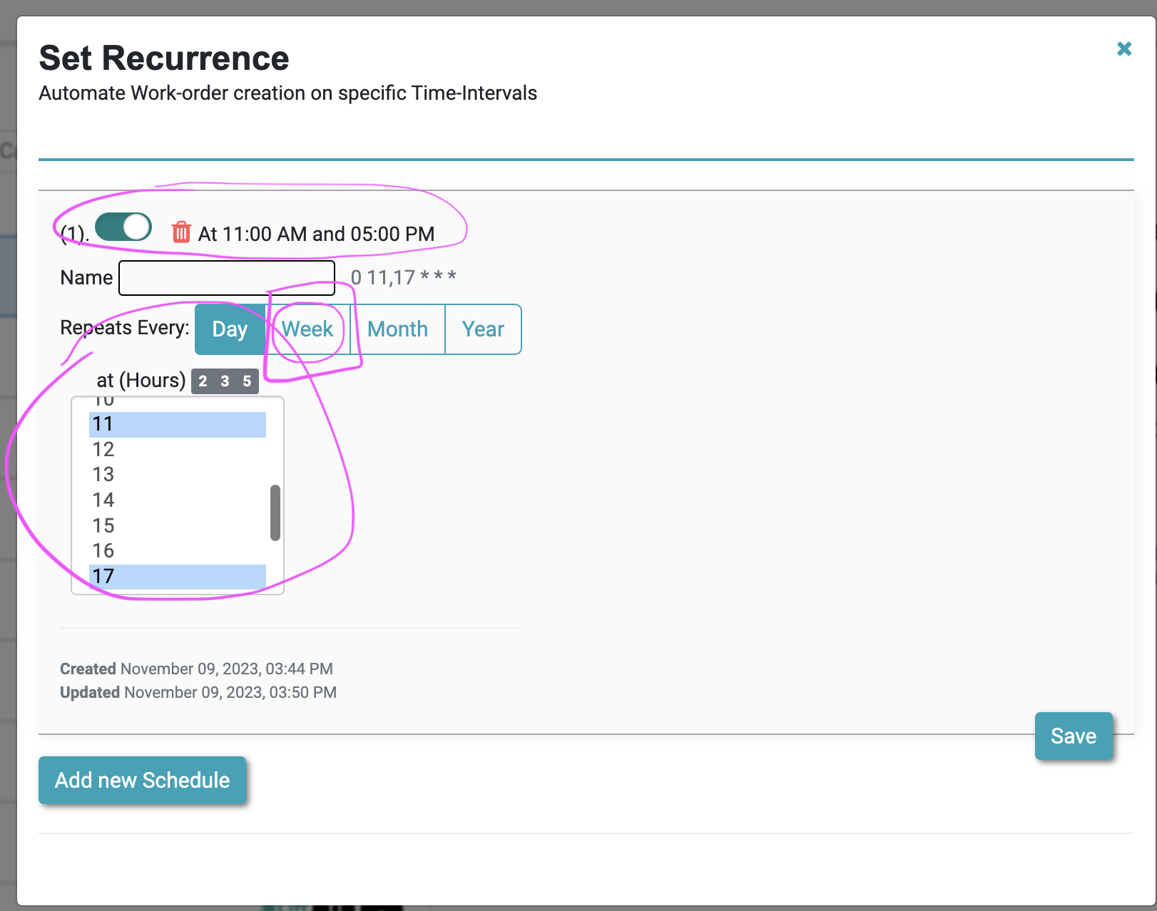 3. Click on the schedule time. A page with existing schedules will be displayed.