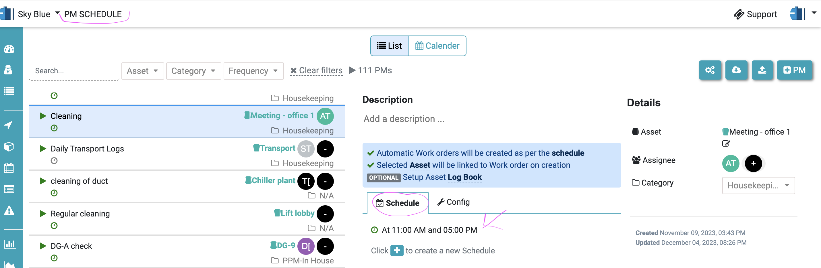 Preventive Maintenance Schedule details in CAFM CMMS