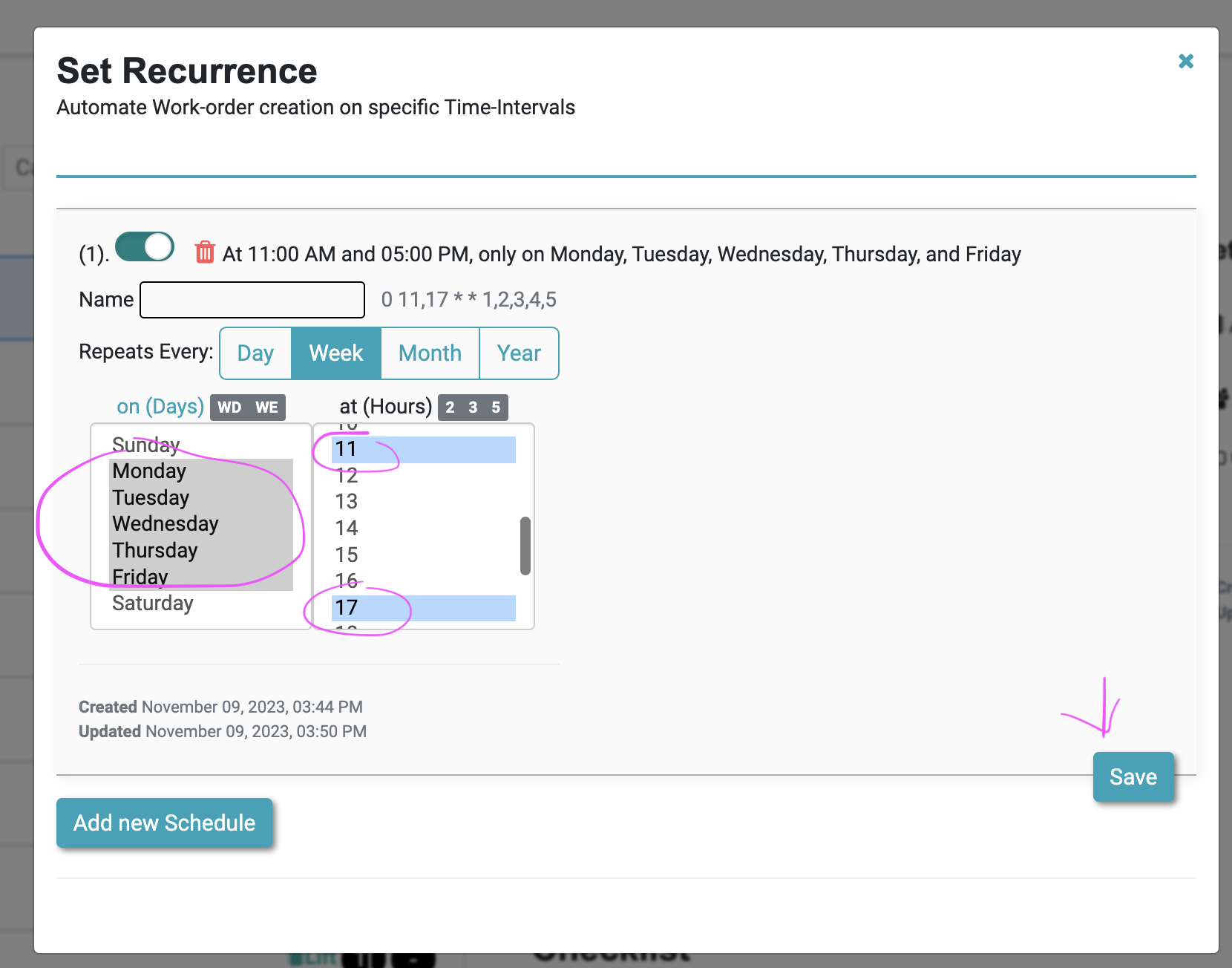 2. Select the schedule. As in below image Cleaning schedule is set for daily 11 am & 5 pm