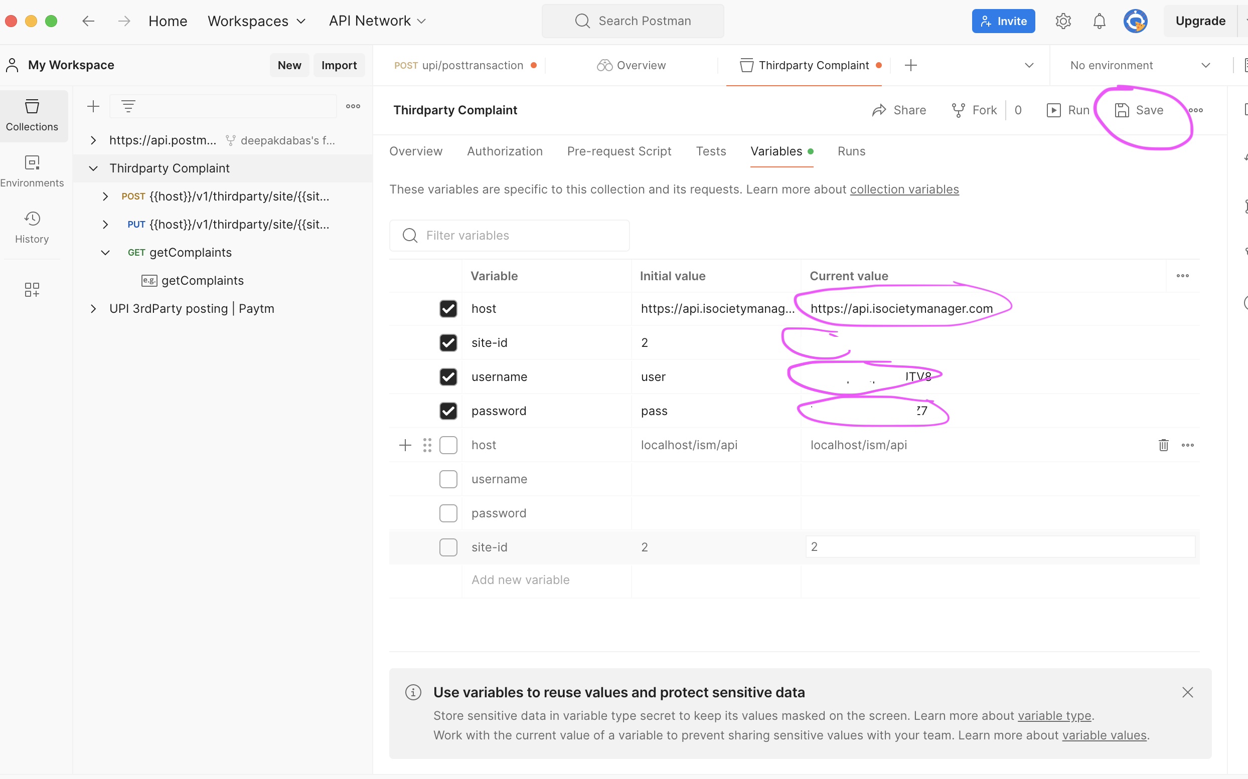 Once collection imported. Add host, site-id, username and password against imported collection in variable tab. Save the same.