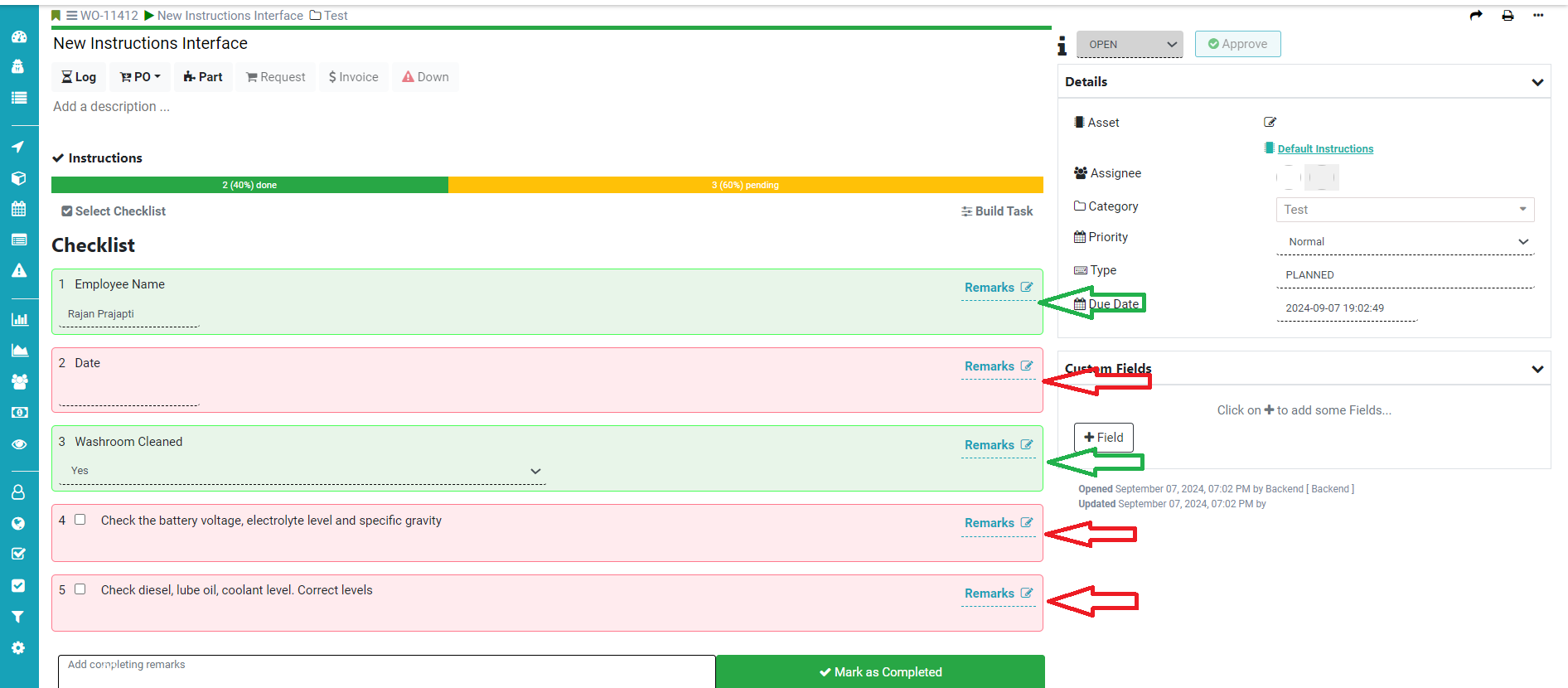 We have an updated interface for the checklist view. After scanning the QR code and filling out the checklist, you will now see an enhanced view of instructions. If an instruction is completed, it will appear in “Green” Color, and if it is not completed, it will appear in “Red” color. This color-coded system ensures a clear and intuitive understanding of the checklist status.
