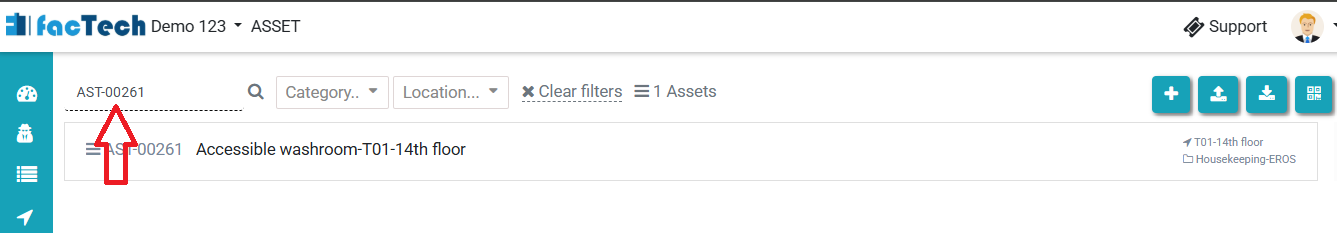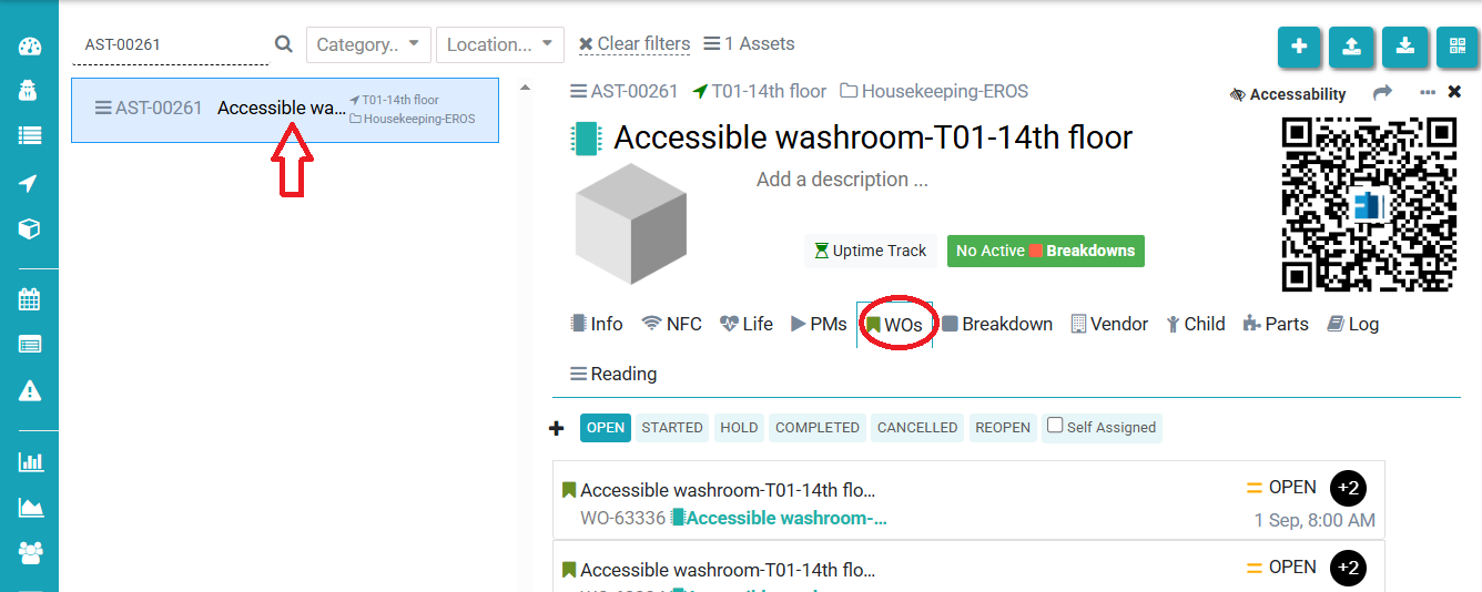 To check if a work order exists for a particular asset or housekeeping task:- Navigate to Asset & PPM > Click on Asset in the left panel and select the desired asset by ID or name.