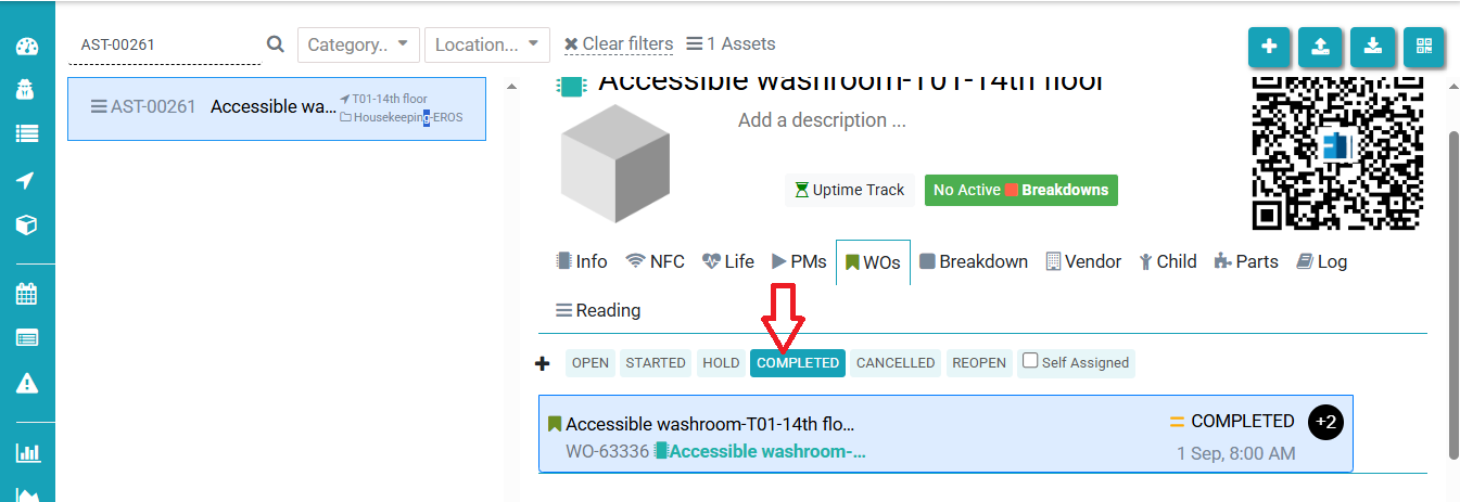 - Go to the WOs tab, then click on Completed to view all completed work orders for the selected asset.
